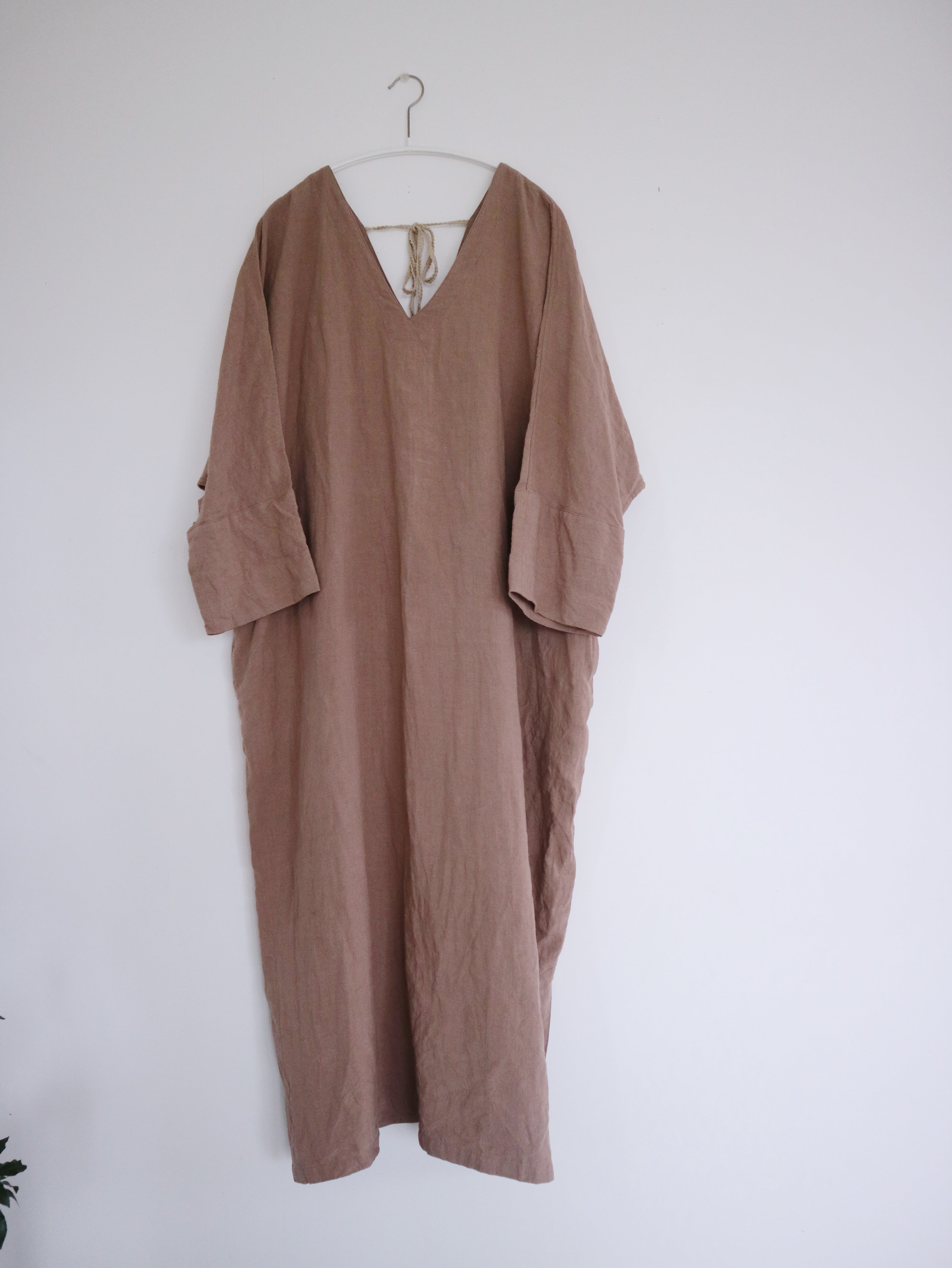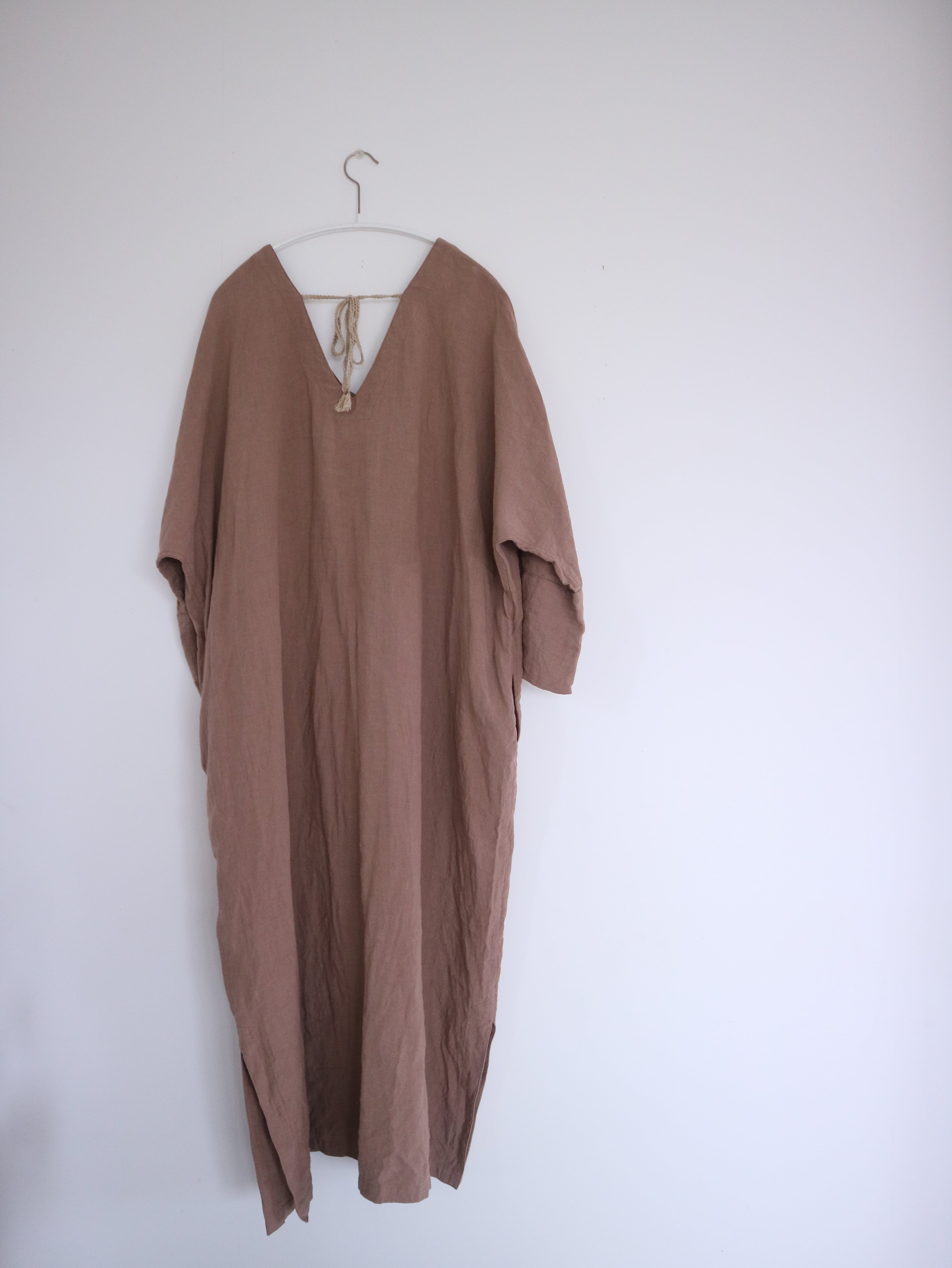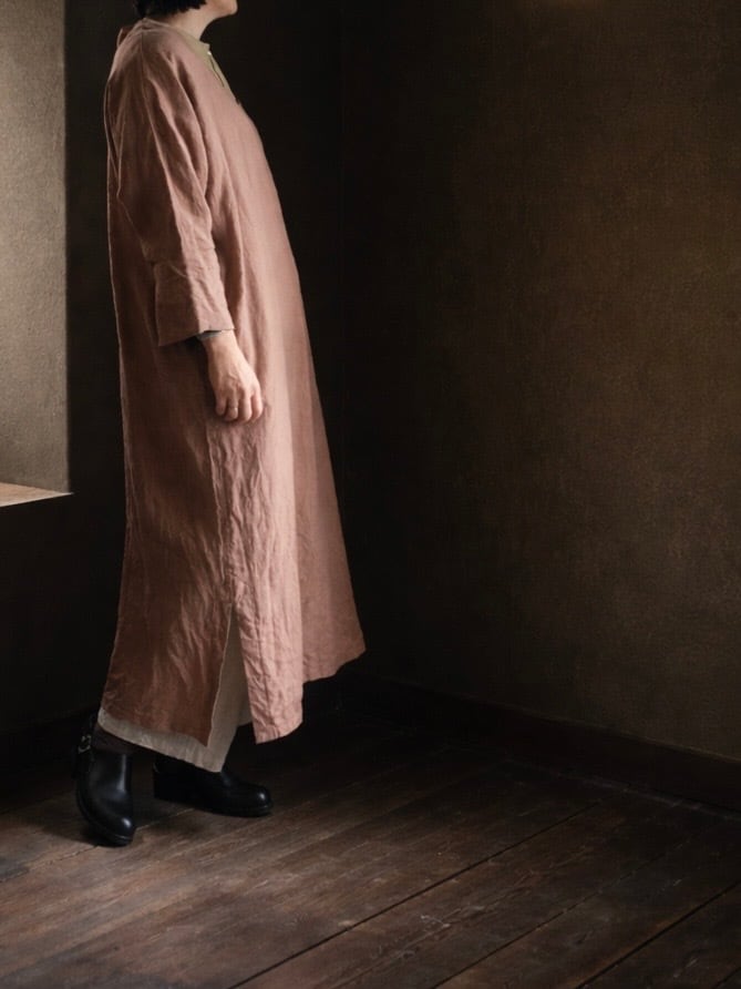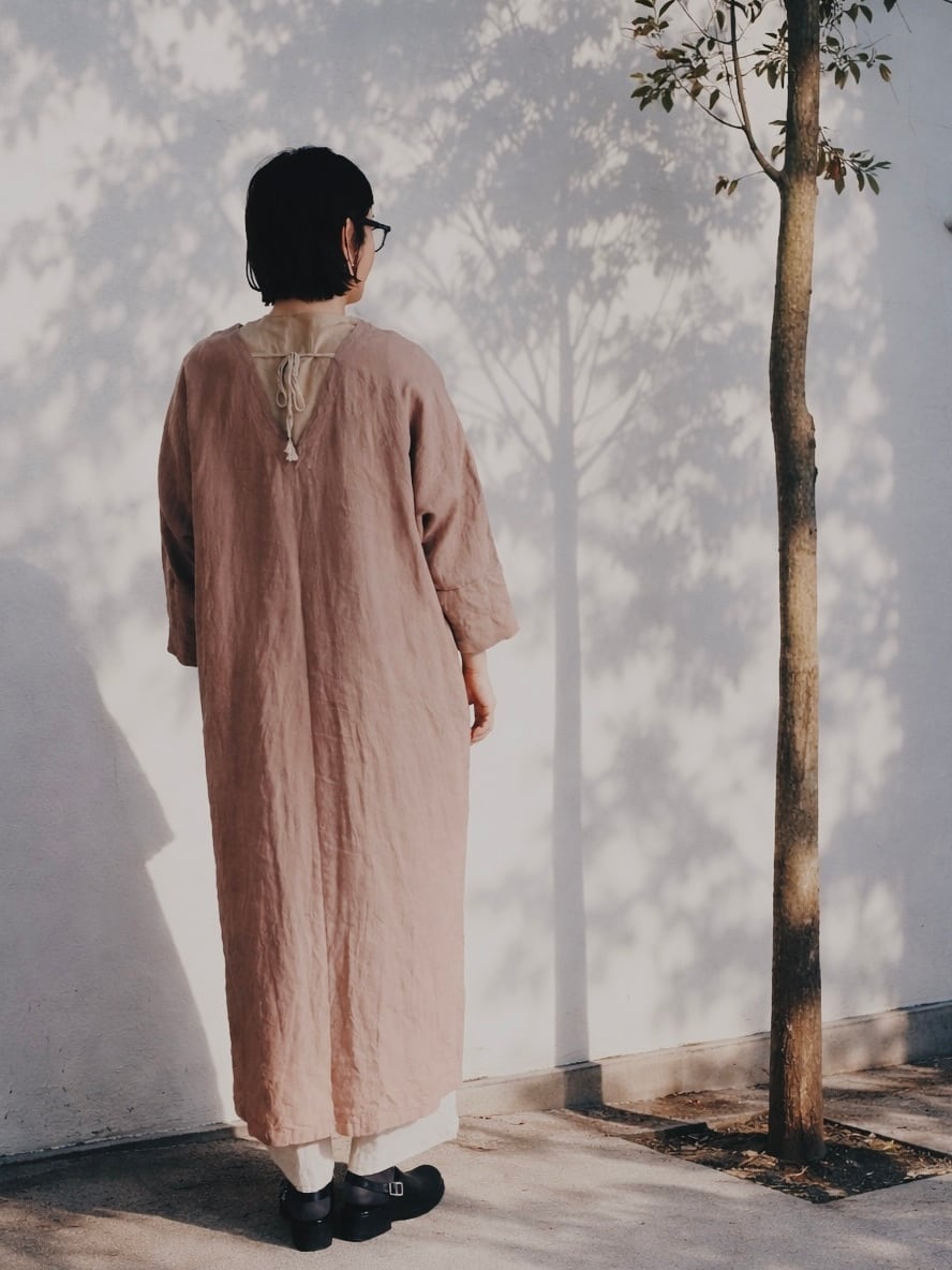 Matelier / linen 100% Color / mocabrown Size / 着丈 約122cm 裄丈 約72cm 身幅 約70cm Model : 164cm ----------------------------------------------- 後ろに紐をあしらった リネンのワンピース。 生地は中厚地のものを使用しています 前は静かに、 後ろにだけ、ほんの少しの遊びを 振り返ったときに やさしく印象に残るワンピースです 一枚でさらりと 重ねて、季節を重ねて 静かな時間に寄り添う一着です ※両サイドにポケットあり
