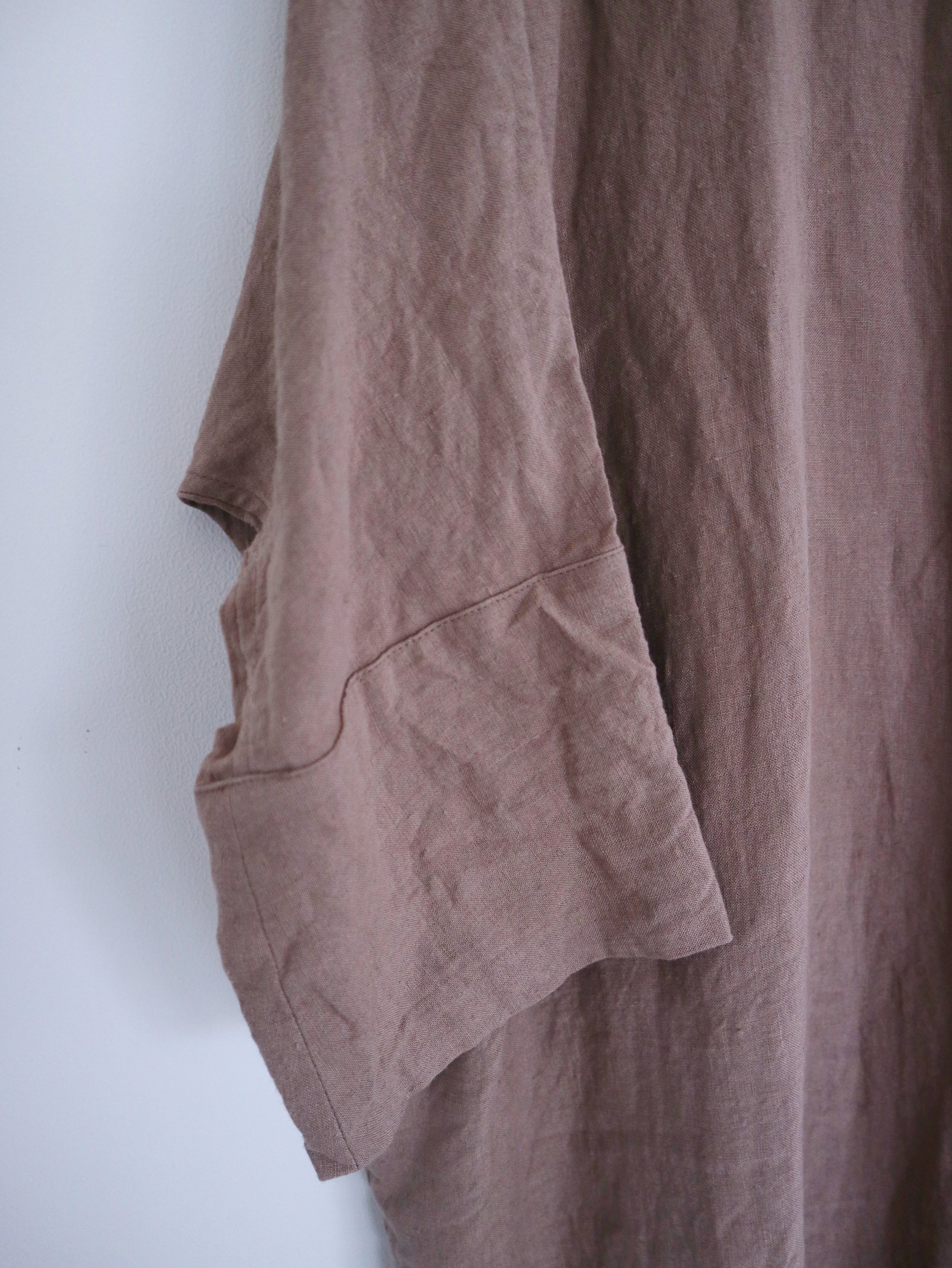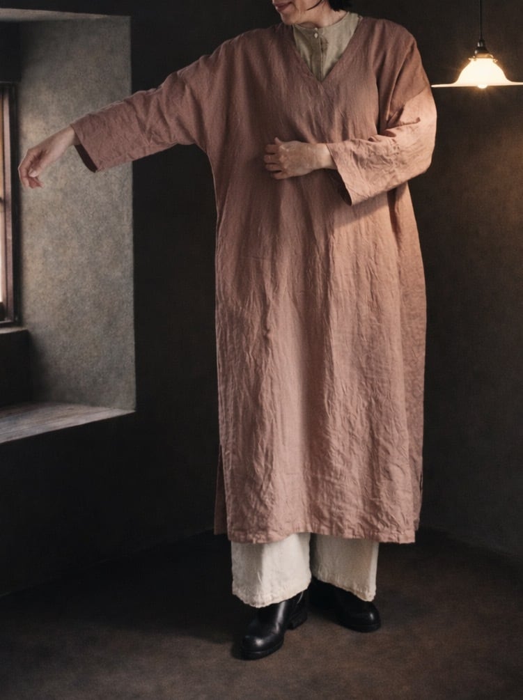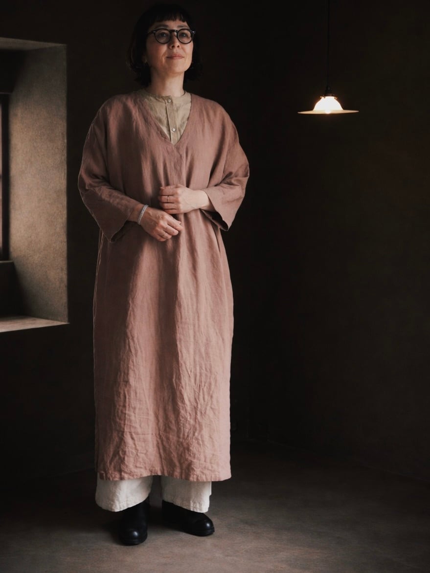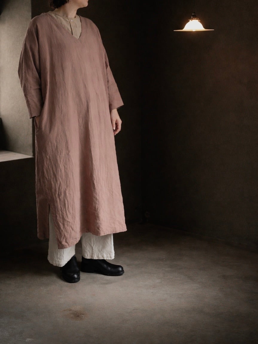 Matelier / linen 100% Color / mocabrown Size / 着丈 約122cm 裄丈 約72cm 身幅 約70cm Model : 164cm ----------------------------------------------- 後ろに紐をあしらった リネンのワンピース。 生地は中厚地のものを使用しています 前は静かに、 後ろにだけ、ほんの少しの遊びを 振り返ったときに やさしく印象に残るワンピースです 一枚でさらりと 重ねて、季節を重ねて 静かな時間に寄り添う一着です ※両サイドにポケットあり
