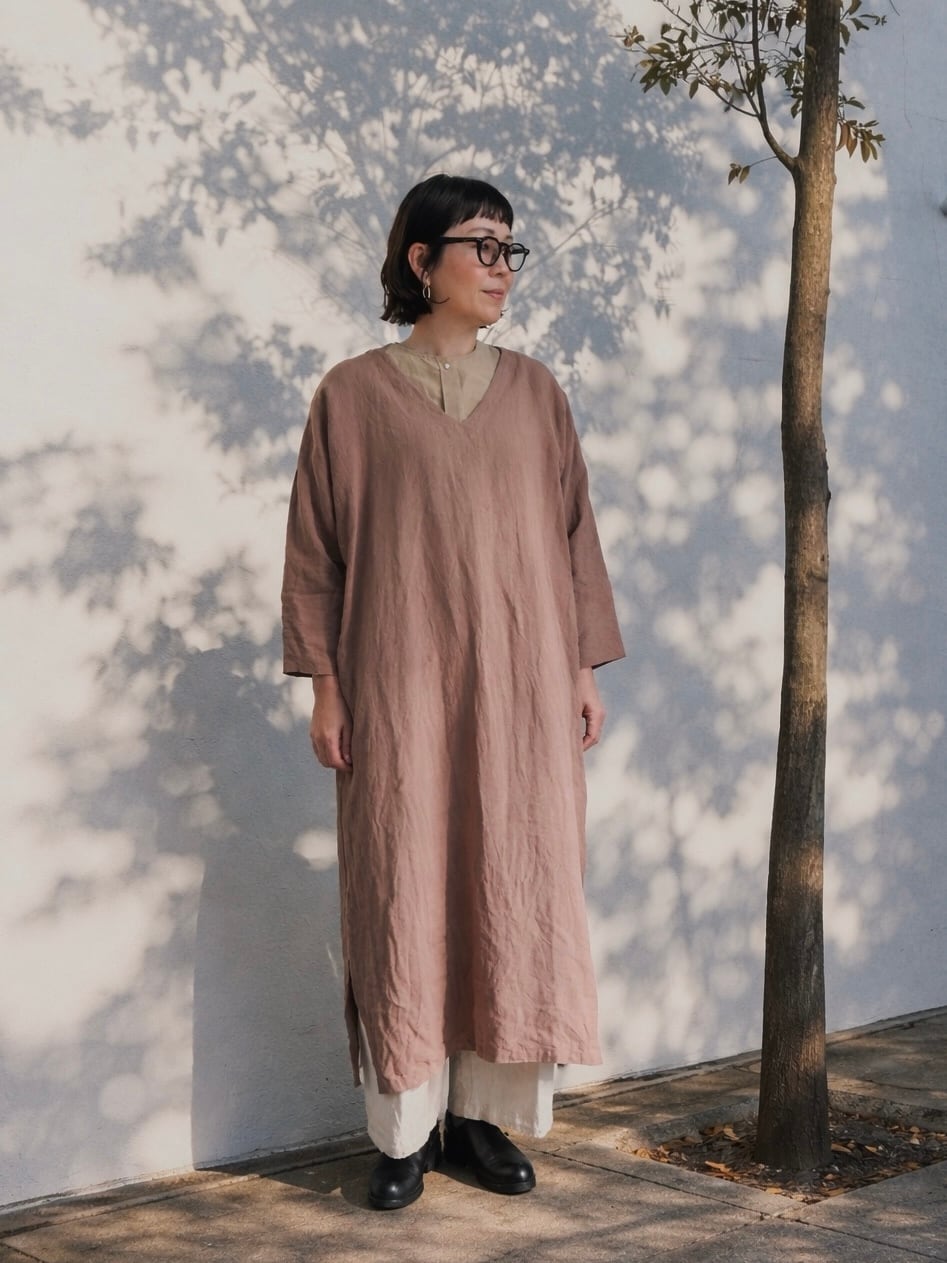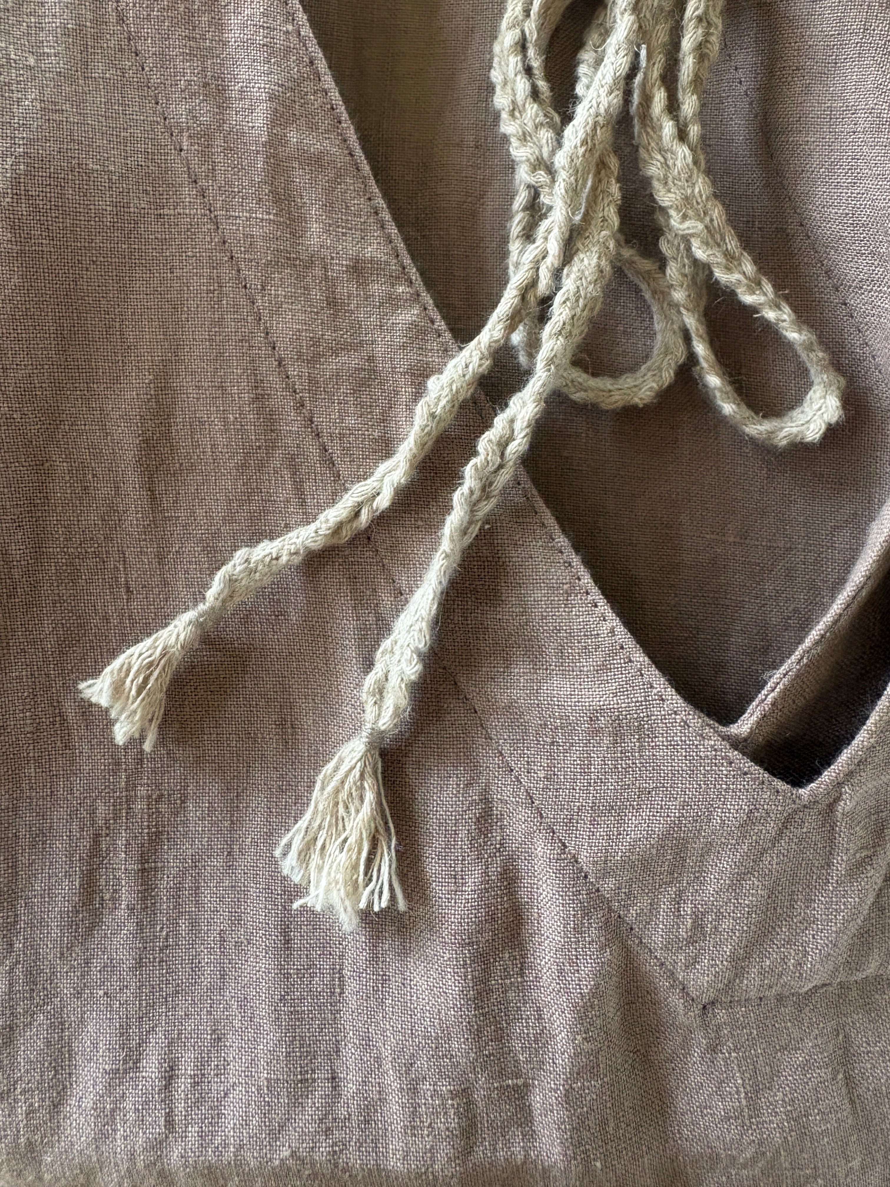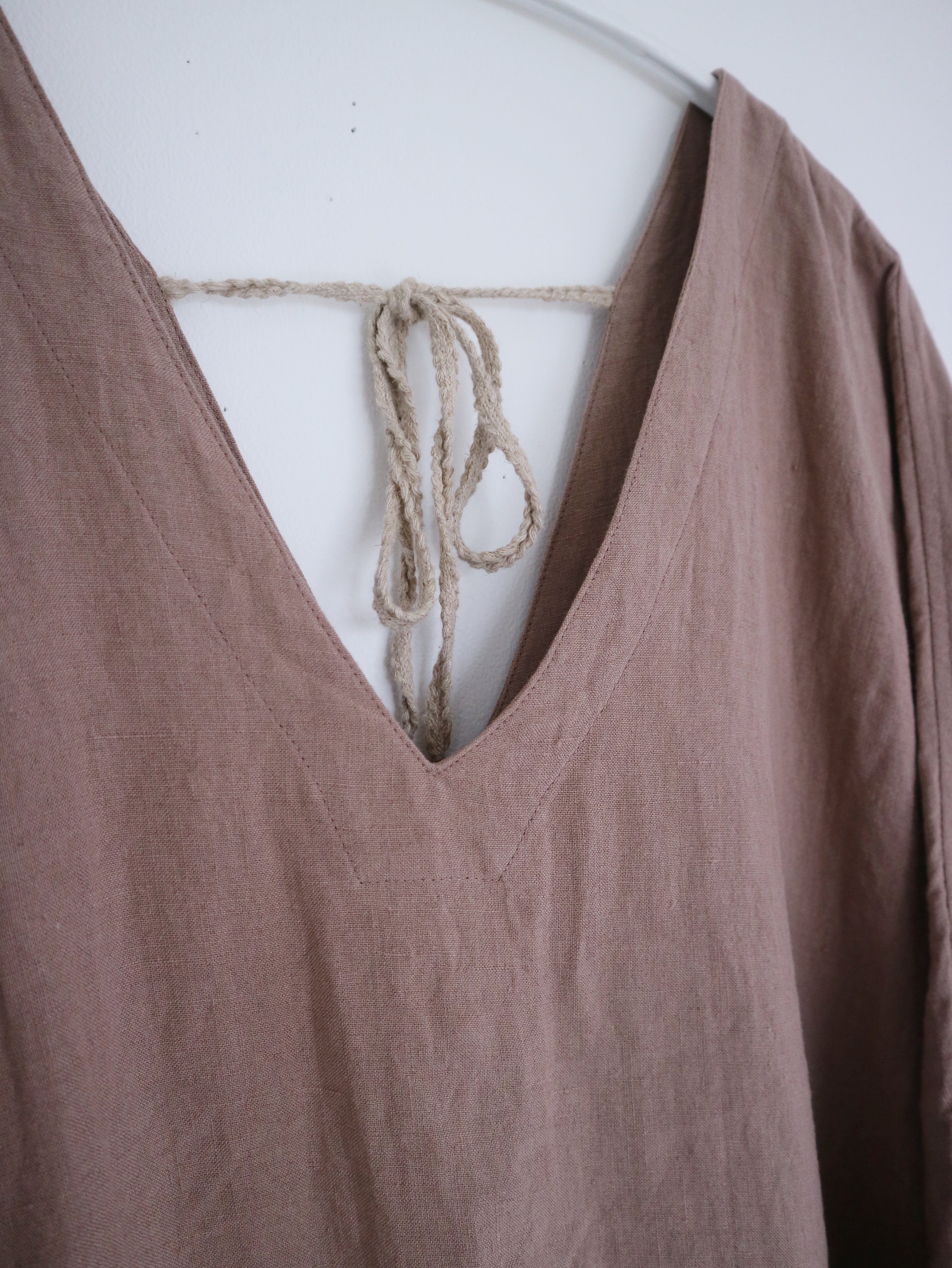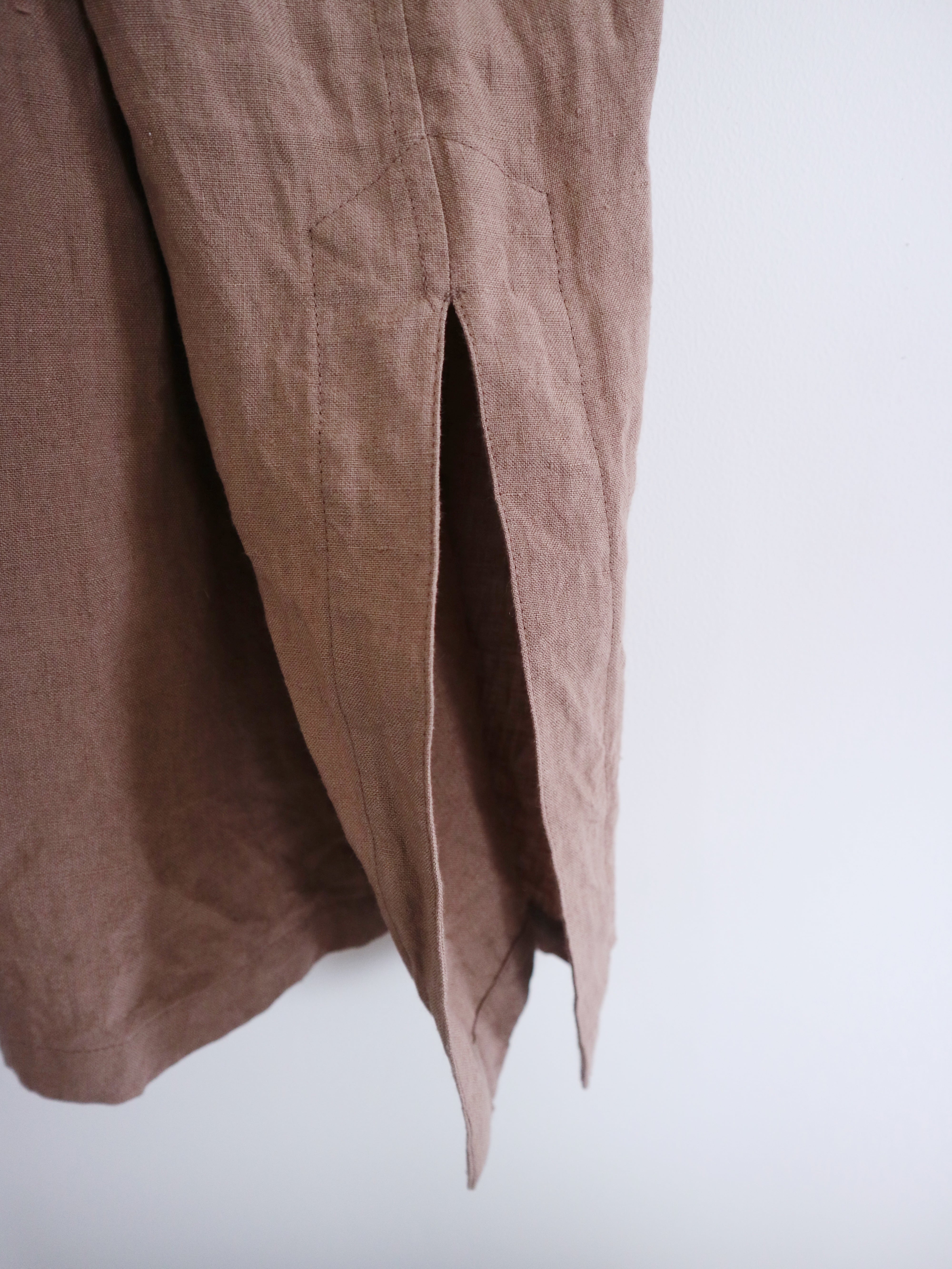 Matelier / linen 100% Color / mocabrown Size / 着丈 約122cm 裄丈 約72cm 身幅 約70cm Model : 164cm ----------------------------------------------- 後ろに紐をあしらった リネンのワンピース。 生地は中厚地のものを使用しています 前は静かに、 後ろにだけ、ほんの少しの遊びを 振り返ったときに やさしく印象に残るワンピースです 一枚でさらりと 重ねて、季節を重ねて 静かな時間に寄り添う一着です ※両サイドにポケットあり